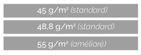 Le poids de couche est compris entre 5 et 10 g/m2 par face et la composition chimique de la couche est sensiblement la même que pour les papiers SC, si ce n’est qu’il n’y a pas de charge dans la masse, mais une couche en surface.